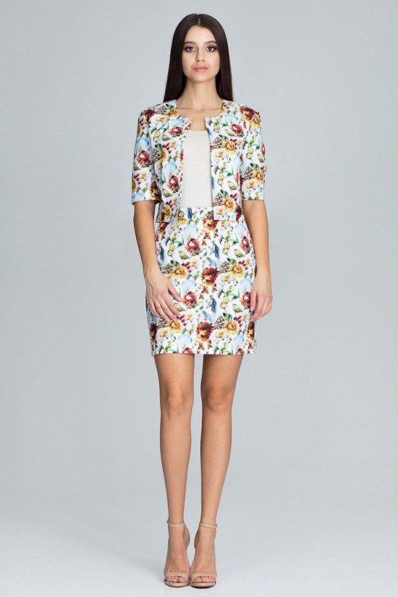 Świetny komplet w kwiatowe wzory. Spódnica przed kolano i żakiet z rękawem 3/4 to świetna propozycja dla modnej kobiety. Lekki materiał dodaje elegancji i komfortu użytkowania.