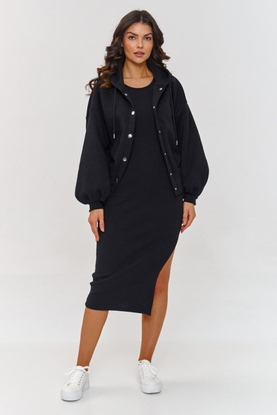 Jeden komplet, wiele możliwości! Sukienka w prążek bez rękawów i rozpinana bluza to zestaw stworzony dla kobiet, które cenią sobie wygodę i uniwersalność. Dzięki dwóm elementom możesz dostosować stylizację do każdej pory roku, latem nosić samą sukienkę, a w chłodniejsze dni dopełnić look ciepłą bluzą. Prążkowana sukienka dopasowuje się do sylwetki, podkreśla kształty, ale nie krępuje ruchów a dodatkowe rozcięcie z boku dodaje jej kobiecości i zmysłowości. Bluza z kapturem ma wygodne zapięcie co sprawia, że pasuje do wielu stylizacji. Dodatkowo jest wykonana z grubszego materiału dresowego co czyni ją na tyle uniwersalną że możesz ją wykorzystać jako dopełnienie stylizacji na każdą porę roku. Bluza została zaprojektowana w luźnym, oversizeowym kroju, co zapewnia pełną swobodę ruchów. A ściągacze na rękawach i u dołu dodają całości modnego designu. Załóż sukienkę solo w cieplejsze dni i ciesz się lekkim, kobiecym lookiem. Gdy zrobi się chłodniej, wystarczy zarzucić bluzę z napami, by stworzyć casualową, praktyczną stylizację, idealną do pracy, na spacer czy szybkie zakupy. Możesz nosić te elementy razem lub osobno, łącząc je z innymi ubraniami sneakersy, botki, trampki. Ten zestaw pasuje do wszystkiego! Wybierz stylowy i funkcjonalny komplet, który dopasuje się do Twojego stylu życia!