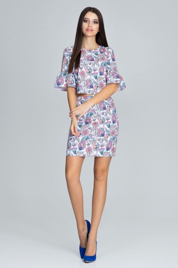 Elegancki komplet bluzka i spódnica w piękne kwiatowe wzory . Bluzka z rękawkiem 3/4 wykończona falbanką sprawi że zwrócisz na siebie uwagę i wyróżnisz się z tłumu.