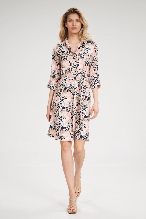 Długa koszulowa sukienka w apnterkę z podpinanym rękawem 3/4. Na wysokości biustu naszywane kieszenie. Zapinana z przodu na guziki, wiązana w pasie.