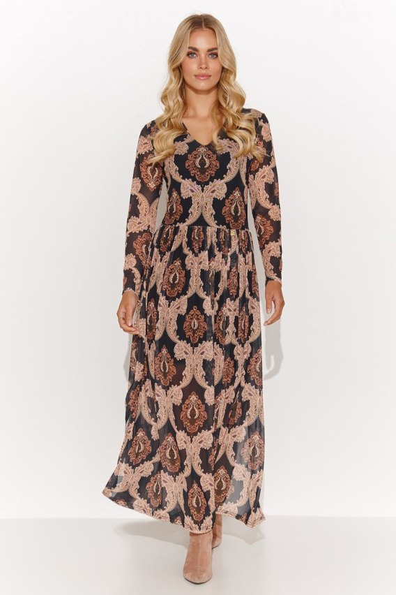 Wyjątkowa długa sukienka wykonana z lekkiej tkaniny to must-have w Twojej szafie. Trójkątny dekolt i długie rękawy nadają sukience casualowego stylu i praktycznego zastosowania na co dzień. Z kolei rozcięcia po bokach dodają lekkości. Ważnym akcentem jest wszyta podszewka z wiskozy, która dyskretnie zakrywa strategiczne miejsca. Materiał wierzchni jest w połowie transparentny, z printami. Kreacja jest dostępna w pięciu wariantach, różniących się kolorem i wzorem. Każdy z nich stanowi idealne połączenie z botkami lub kozakami oraz eleganckim płaszczem. Ta sukienka zapewni Ci poczucie wyjątkowości i sprawdzi się na wiele okazji, od romantycznej kolacji po spontaniczny spacer po mieście.