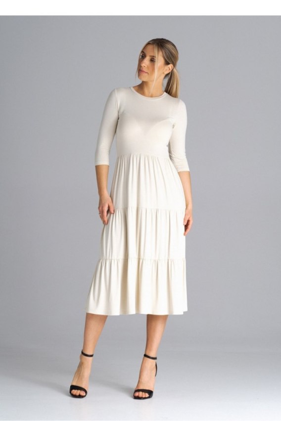 Sukienka midi z rękawem 3/4, w pasie dopasowana. Od pasa w dół trzy marszczone falbany. Sukienka zakładana przez głowę.
