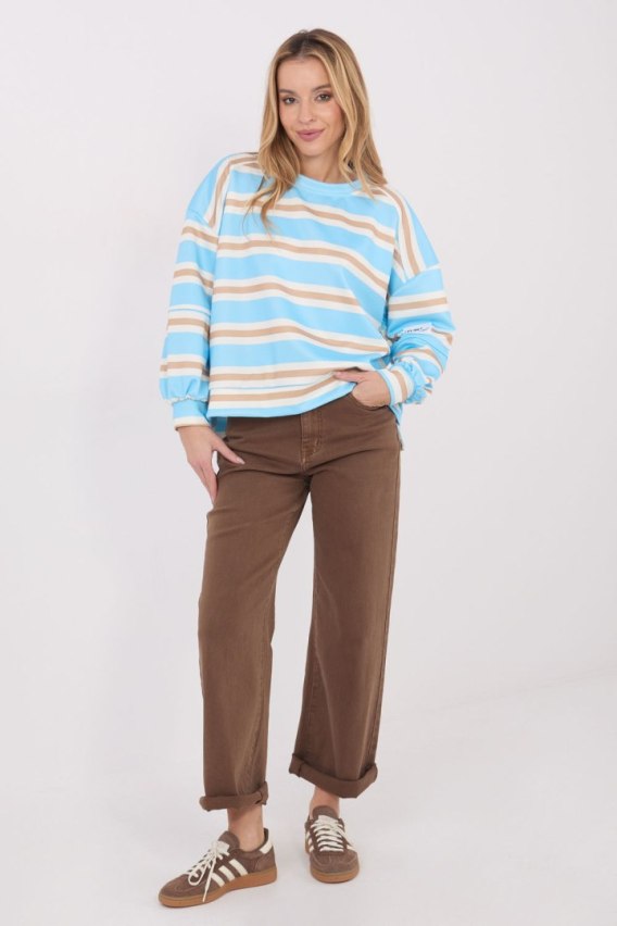 Stylowa bluza damska o casualowym charakterze, idealna na co dzień. Wyróżnia się modnym wzorem w paski, który nadaje jej nowoczesnego i uniwersalnego wyglądu. Wykonana z przyjemnej w dotyku wiskozy z dodatkiem elastanu, dzięki czemu jest miękka, elastyczna i komfortowa w noszeniu przez cały dzień. Model o standardowej długości, z długim rękawem i okrągłym dekoltem, który klasycznie układa się na sylwetce. Bluza nie posiada zapięcia, co podkreśla jej swobodny styl i wygodę użytkowania. Dodatkowym atutem jest dekoracyjna naszywka na rękawie, nadająca całości oryginalnego charakteru. Świetnie sprawdzi się w codziennych stylizacjach, zarówno z jeansami, jak i spodniami materiałowymi czy legginsami.
