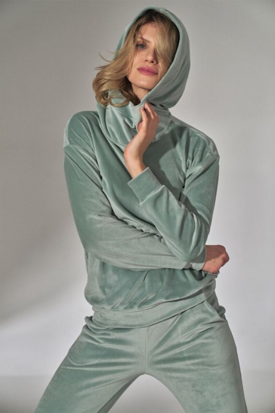 Miętowa welurowa bluza z kapturem z luźną stójką. Długi rękaw i dół bluzy wykończony ściągaczem.