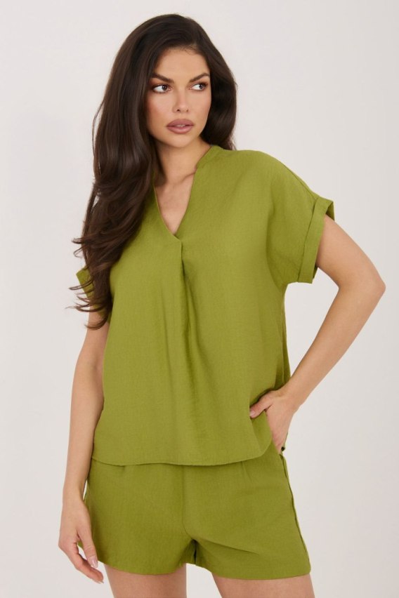 Elegancka, a zarazem wygodna bluzka damska to doskonały wybór na codzienne stylizacje. Wykonana z wysokiej jakości mieszanki wiskozy i poliamidu, zapewnia lekkość, przewiewność oraz komfort noszenia przez cały dzień. Model o standardowej długości z krótkim rękawem świetnie sprawdzi się w cieplejsze dni, oferując swobodę ruchów i uniwersalny wygląd. Gładki materiał podkreśla minimalistyczny charakter bluzki, dzięki czemu łatwo dopasujesz ją do wielu elementów garderoby. Na przodzie znajduje się ozdobna zakładka, która dodaje całości subtelnej elegancji i wyróżnia model spośród klasycznych fasonów. Dekolt w serek połączony ze stójką nadaje nowoczesnego i stylowego akcentu, pięknie eksponując szyję. Bluzka nie posiada zapięcia, co zwiększa wygodę użytkowania. Idealna na co dzień do pracy, na spotkania czy spacer, doskonale komponuje się zarówno ze spodniami, jak i spódnicą.