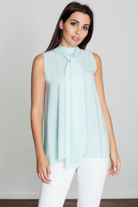 Gładka rozkloszowana bluzka, model odsłaniający ramiona. Z przodu ozdobne wiązanie, z tyłu bluzka zapinana na kryty suwak.
