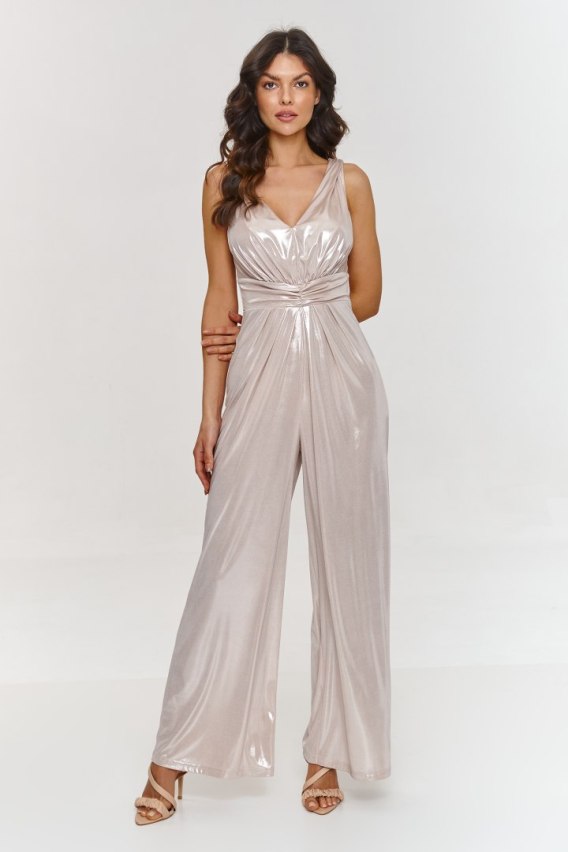 Przedstawiamy elegancki kombinezon, wykonany z metalicznego materiału dzięki któremu zyskujemy efektowny i nowoczesny wygląd. Głęboki dekolt w serek eksponuje ramiona i szyję, dodając stylizacji zmysłowości i elegancji natomiast wąskie ramiączka nadają całości uniwersalności. Góra jest dopasowana, odcięta w tali szerokim pasem, który doskonale podkreśla sylwetkę tworząc efekt smuklejszej figury. Natomiast szerokie, proste nogawki nadają mu lekkości i klasy stając się nowoczesnym wyborem, który przyciąga uwagę i pozwala poczuć się stylowo i pewnie. Dodatkowo z tyłu znajduje się delikatne wycięcie eksponujące plecy, wykończone zamkiem błyskawicznym ułatwiającym zakładanie. Nasz metaliczny kombinezon to doskonały wybór na wieczorne wyjścia, imprezy okolicznościowe oraz stylowe bankiety. Dzięki swojej nowoczesnej konstrukcji, zapewni Ci nie tylko komfort przez cały wieczór, ale również olśniewający wygląd, który przyciągnie wszystkie spojrzenia. Połącz go z eleganckimi szpilkami i biżuterią, aby stworzyć niepowtarzalną stylizację.