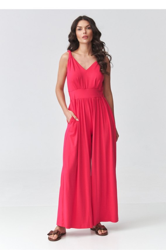 Stylowy kombinezon damski na ramiączkach to idealna propozycja dla kobiet, które szukają połączenia elegancji i wygody. Lekki, lejący materiał pięknie układa się na sylwetce, a podkreślona talia nadaje figurze proporcji i kobiecego charakteru. Subtelny dekolt w serek (V-neck) wysmukla górną część sylwetki i dodaje całości lekkości. Model posiada szerokie nogawki, które zapewniają swobodę ruchów i wpisują się w aktualne trendy. Dzięki temu długi kombinezon damski doskonale sprawdzi się zarówno na co dzień, jak i podczas wyjątkowych okazji. To świetna alternatywa dla sukienki, idealny jako kombinezon na wesele, przyjęcie, wakacyjny wyjazd czy randkę. Uniwersalny fason pozwala na różnorodne stylizacje, w połączeniu z sandałami tworzy lekki, letni look, a ze szpilkami nabiera bardziej eleganckiego charakteru. Jeśli szukasz ponadczasowego modelu, ten modny kombinezon z szerokimi nogawkami będzie doskonałym wyborem.