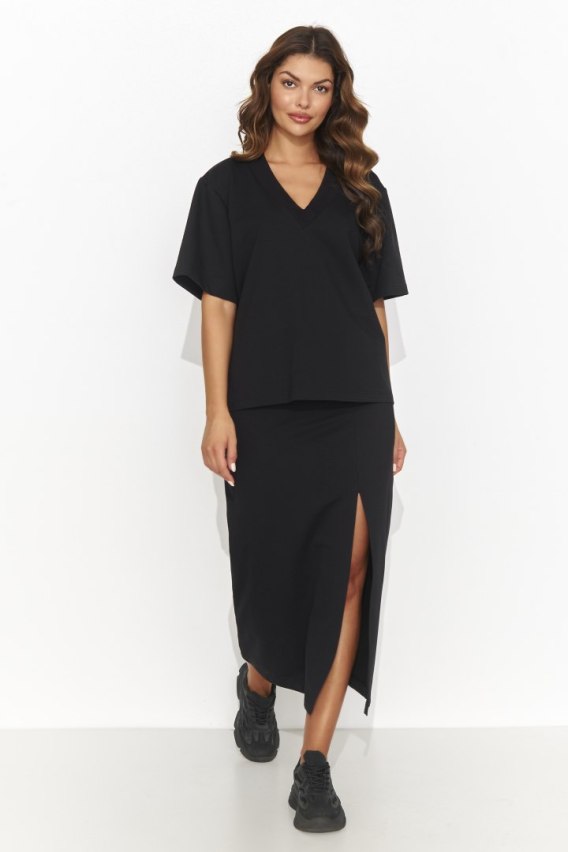 Damski zestaw, który emanuje elegancją i swobodą, składający się z ołówkowej spódnicy za kolano z delikatnym rozcięciem oraz luźnej koszulki z krótkim rękawem i dekoltem w serek. Detal zwracający uwagę to ozdobna złota blaszka, umieszczona z tyłu bluzki, dodająca nutę subtelnej ekstrawagancji. Ten komplet jest dostępny w trzech urokliwych kolorach: jasny beż, czarny i czekoladowy, co pozwala dostosować go do różnych okazji i stylizacji. Spódnica ołówkowa podkreśla kobiecą sylwetkę, jednocześnie zapewniając komfort noszenia, a luźna koszulka dodaje lekkości i swobody. To idealne połączenie klasyki z nowoczesnością, które z pewnością przyciągnie uwagę fanek mody.