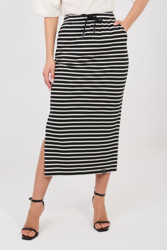 Stylowa spódnica damska w casualowym stylu to idealna propozycja do codziennych stylizacji. Sprawdzi się zarówno na spacer, zakupy, jak i spotkanie ze znajomymi, zapewniając komfort i modny wygląd. Model wykonany jest z wysokiej jakości bawełny, dzięki czemu materiał jest przewiewny, przyjemny dla skóry i wygodny w noszeniu przez cały dzień. Spódnica posiada długość midi, która nadaje jej uniwersalnego i kobiecego charakteru. W pasie znajduje się wszyta elastyczna guma, która zapewnia dobre dopasowanie do sylwetki oraz wygodę użytkowania. Dodatkowym elementem jest wiązanie w pasie, które pełni funkcję ozdobną i podkreśla talię. Całość zdobi modny wzór w paski, nadający spódnicy lekkości i letniego stylu. Model wyposażony jest również w praktyczne kieszenie wsuwane, które zwiększają funkcjonalność. To doskonały wybór na codzienne stylizacje, łączący wygodę z ponadczasowym wyglądem.