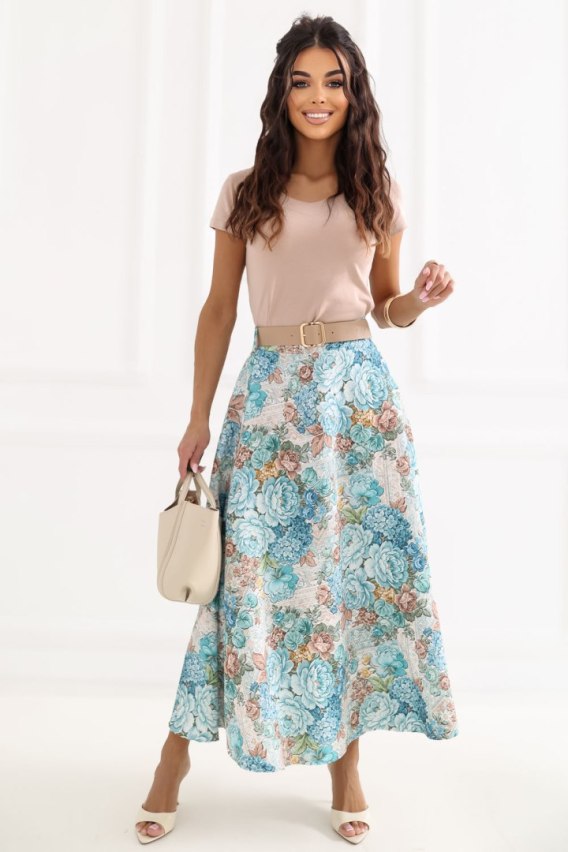 Stylowa spódnica midi o eleganckim, a zarazem uniwersalnym charakterze. Doskonale sprawdzi się zarówno w stylizacjach do pracy, na spotkania wizytowe, jak i na co dzień. Model wyróżnia się modnym nadrukiem w kwiaty, który dodaje lekkości i kobiecego uroku. Wykonana z wysokiej jakości mieszanki poliestru z dodatkiem elastanu, zapewnia komfort noszenia oraz swobodę ruchów. Spódnica nie posiada klasycznego zapięcia, w pasie z tyłu wszyta została elastyczna guma, która dopasowuje się do sylwetki i gwarantuje wygodę przez cały dzień. Dodatkowym elementem jest zapinany pasek, który podkreśla talię i nadaje całości eleganckiego wykończenia. Długość midi sprawia, że model prezentuje się niezwykle stylowo i pasuje do wielu okazji. Idealna do zestawienia zarówno z koszulą i marynarką, jak i z lekkim topem czy swetrem.