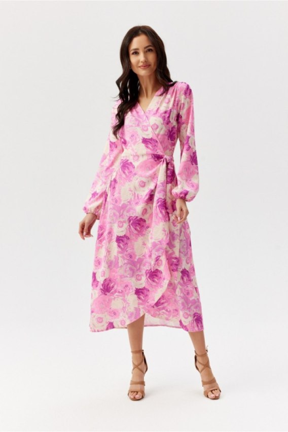 Sukienka midi z długimi rękawami. Góra kopertowa, a dół delikatnie rozkloszowany. Nie posiada podszewki, w pasie podwójne wiązanie.
