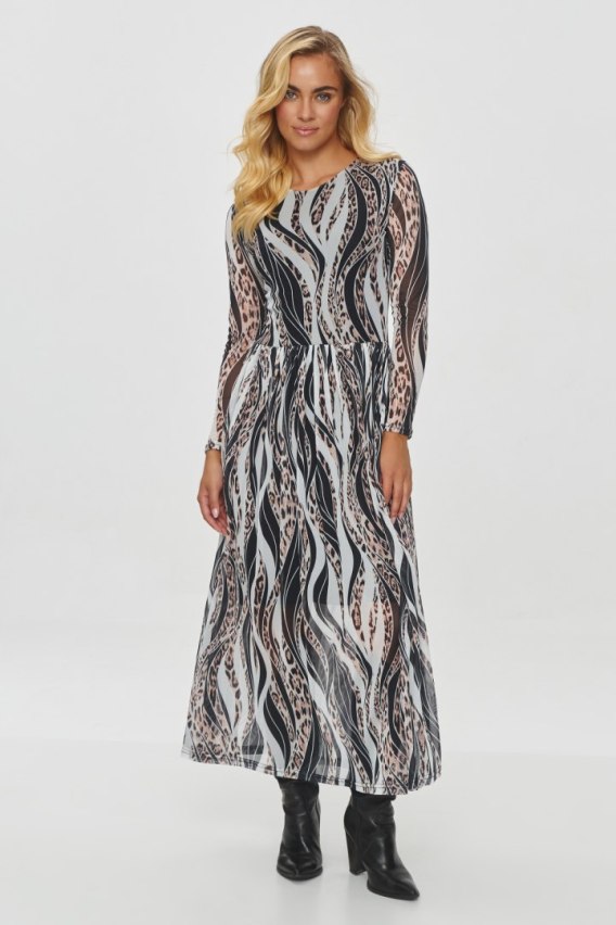 Długa printowa sukienka wykonana z lekkiego, zwiewnego materiału, który nadaje jej eleganckiego i romantycznego wyglądu. Wzór sukienki to złożona mieszanka motywów roślinnych, zwierzęcych i abstrakcyjnych, w kolorach dominujących czarnych, białych, beżowych, brązowych i odcieniach pomarańczy. Wzór jest skomplikowany i jednocześnie oryginalny dodający kreacji wyrazistego stylu. Model ma lekko dopasowaną górę, która podkreśla talię, natomiast dół jest rozkloszowany, co dodaje jej lekkości i ruchu. Wykończenie sukienki jest subtelne, a materiał jest półprzezroczysty, co podkreśla jej delikatność. Sukienka posiada wiskozową podszewkę, która dyskretnie zakrywa strategiczne miejsca i zapewnia komfort podczas noszenia. W połączeniu z ciężkimi butami za kostkę tworzy kontrast z subtelnością sukienki, nadając całości nieco bardziej casualowy wygląd. Sukienka idealnie nadaje się na jesienne lub zimowe wieczory, dzięki swoim ciepłym kolorom i długim rękawom. Kreacja jest dostępna w pięciu wariantach, różniących się kolorem i wzorem.