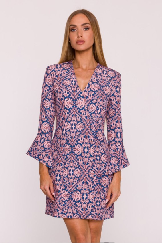Wyjątkowa sukienka z tkaniny o wielobarwnym nadruku roślinnym to propozycja, która łączy kobiecy wdzięk z nutą stylu retro. Matowe wykończenie materiału nadaje całości elegancji i subtelności, a dekoracyjny florystyczny wzór przyciąga uwagę i ożywia stylizację. Model ma dekolt w kształcie litery V, który pięknie wysmukla szyję i dodaje lekkości. Rękawy o długości 7/8 zakończone są delikatnym rozszerzeniem, co nadaje całości zwiewny i nieco romantyczny charakter. Sukienka zapinana jest z tyłu na kryty zamek, który zapewnia wygodę i estetyczne wykończenie. Prosty, lekko taliowany fason został zaprojektowany tak, aby delikatnie podkreślać sylwetkę, pozostając swobodnym ku dołowi. Długość mini nadaje całości młodzieńczego charakteru i sprawia, że sukienka świetnie sprawdzi się zarówno na co dzień, jak i w bardziej wyjątkowych okolicznościach. Zaprojektowana i uszyta w Polsce dla kobiet, które cenią styl, wygodę i oryginalne detale.