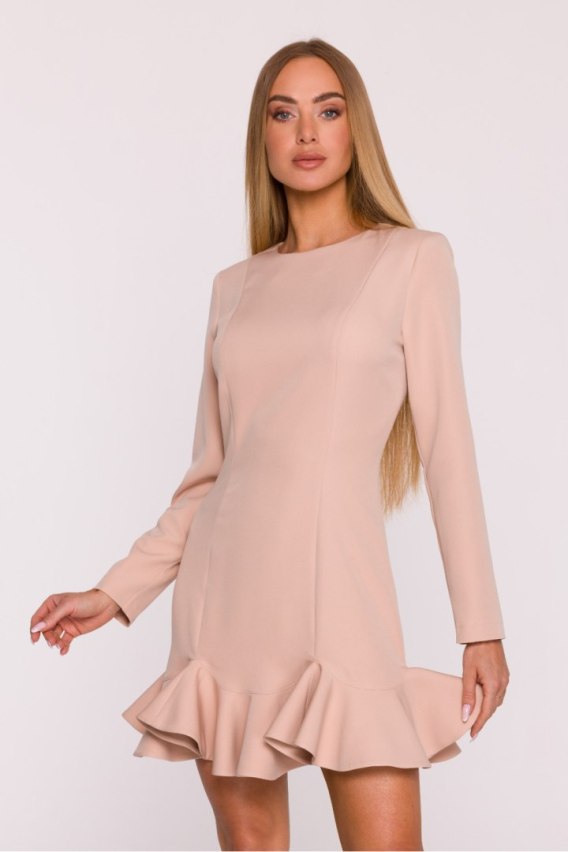 Subtelna i kobieca sukienka uszyta z gładkiej tkaniny o matowym wykończeniu to doskonała propozycja na wiele okazji. Prosta forma została urozmaicona fantazyjną falbaną u dołu, która nadaje całości lekkości i dziewczęcego uroku. Model posiada klasyczny, półokrągły dekolt oraz długie rękawy, dzięki czemu prezentuje się elegancko i ponadczasowo. Kryty zamek z tyłu zapewnia wygodę zakładania i estetyczne wykończenie. Brak kieszeni i podszewki sprawia, że sukienka jest lekka, komfortowa i świetnie układa się na sylwetce. Fason został zaprojektowany tak, aby subtelnie podkreślać figurę górę tworzy prosta, lekko taliowana linia z modelującymi przeszyciami, a dół rozkloszowany z falbaną pięknie pracuje w ruchu. Mini długość dodaje kreacji świeżości i nowoczesnego charakteru. Zaprojektowana i uszyta w Polsce, z myślą o kobietach ceniących prostą elegancję z nutą oryginalności.
