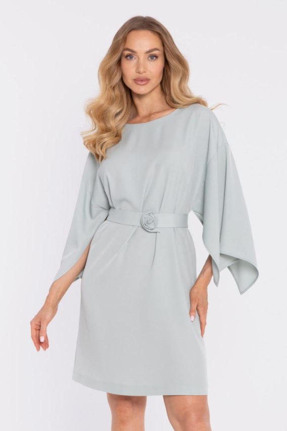 Minimalistyczna sukienka o nowoczesnym, eleganckim charakterze, która zachwyca prostotą formy i subtelnym połyskiem tkaniny. Wykonana z gładkiego materiału z delikatnym połyskiem, pięknie układa się na sylwetce i nadaje stylizacji wyrafinowanego wykończenia. Model posiada dekolt typu łódka, lekko zabudowany, który subtelnie podkreśla linię szyi i obojczyków. Szerokie, luźne rękawy w stylu kimono/pelerynki efektownie opadają, dodając lekkości i swobody ruchu. Talia została zaakcentowana paskiem do wiązania (w komplecie), co pozwala na indywidualne dopasowanie i modelowanie sylwetki. Góra pozostaje luźna i swobodna, natomiast dół o prostym, lekko trapezowym kroju zapewnia elegancki i harmonijny efekt. Sukienka zakładana jest przez głowę, bez zapięcia, co zwiększa komfort użytkowania. Model nie posiada kieszeni ani podszewki, dzięki czemu jest lekki i wygodny. Zaprojektowana i uszyta w Polsce, stanowi idealną propozycję dla kobiet ceniących minimalizm, wygodę i ponadczasową elegancję. Długość przed kolano sprawia, że świetnie sprawdzi się zarówno na co dzień, jak i na bardziej wyjątkowe okazje.