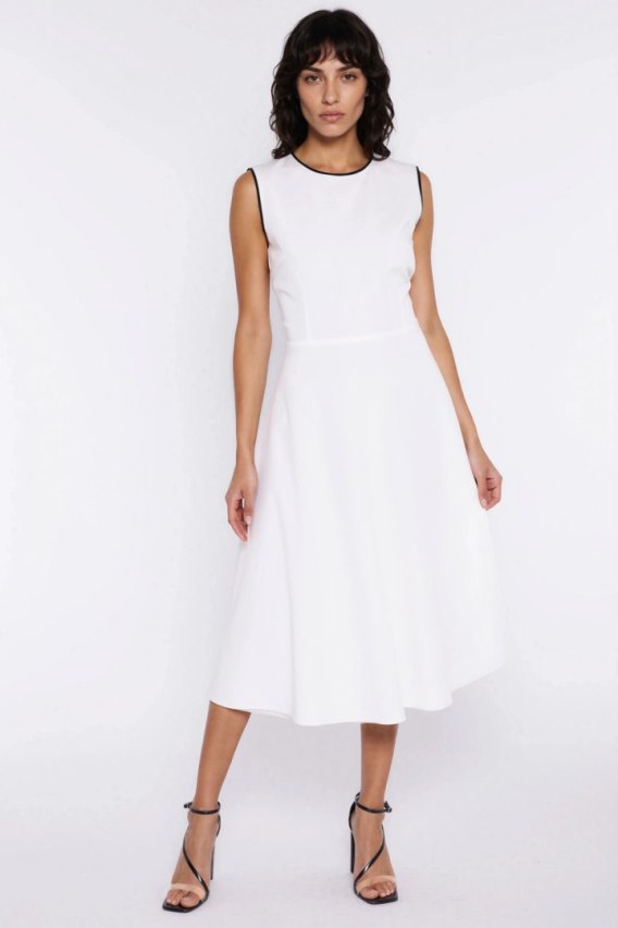 Elegancka sukienka o kobiecym fasonie, który pięknie podkreśla sylwetkę. Góra o dopasowanym kroju subtelnie modeluje figurę, natomiast trapezowy dół nadaje lekkości i swobody ruchów. Model odcinany w pasie akcentuje talię, tworząc harmonijną proporcję. Sukienka posiada okrągły dekolt pod szyję oraz jest bez rękawów, co nadaje jej klasyczny i ponadczasowy charakter. Kontrastowa lamówka przy dekolcie i ramionach stanowi stylowy detal, który przyciąga uwagę i dodaje całości elegancji. Długość za kolano sprawia, że model świetnie sprawdzi się zarówno na co dzień, jak i na bardziej formalne okazje. Sukienka jest zapinana na zamek z tyłu, co ułatwia zakładanie, a podszewka zapewnia komfort noszenia i estetyczne wykończenie.